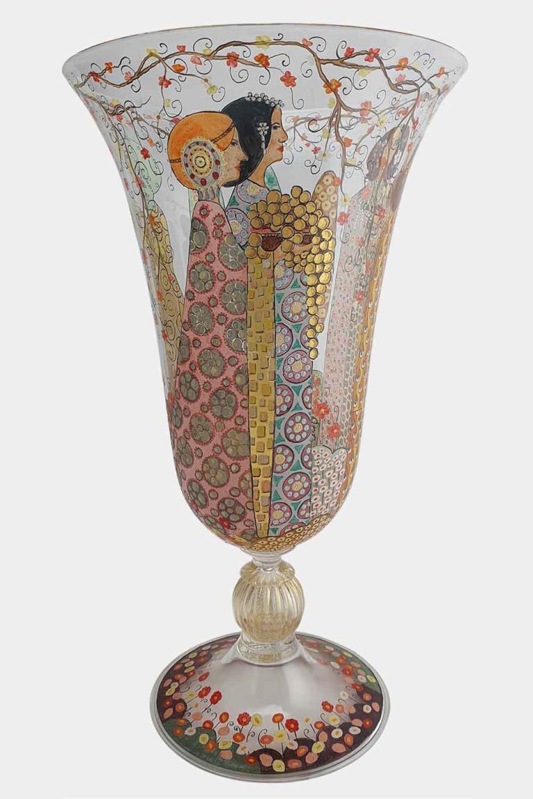 Vaso in colore trasparente ispirato all'opera "Le mille e una notte" (Museo Ca' Pesaro, Venezia) dell'artista muranese Vittorio Zecchin (1874-1947), Decorato a mano dalla maestra Elena Bucella con smalti e foglia oro 24kt graffito